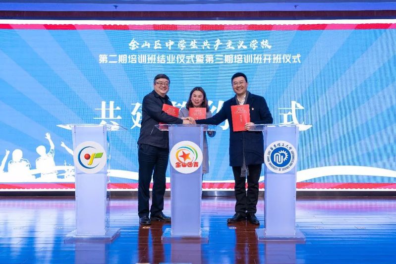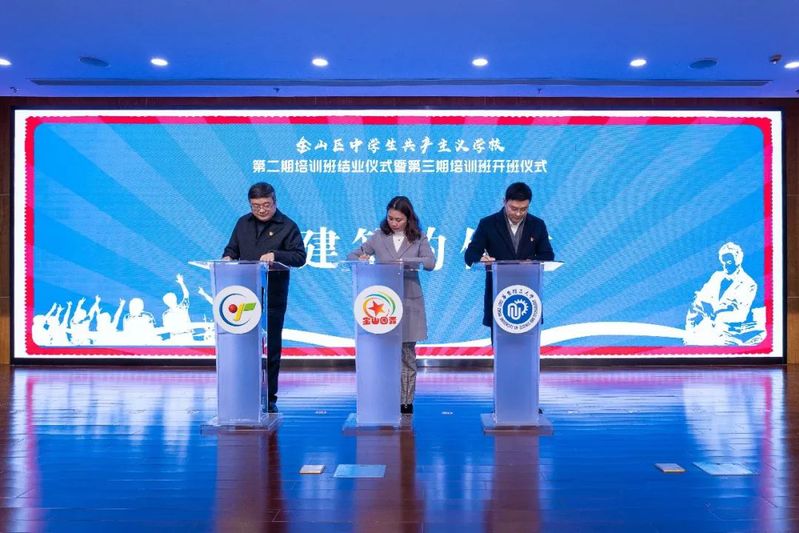 最后,签约仪式正式开始,顾宏伟书记、张敏书记与陈俊傲书记共同签署“金山区中学生共产主义学校”共建合作协议,戴冰副书记、白锦波部长为金山区中学生共产主义学校揭牌。