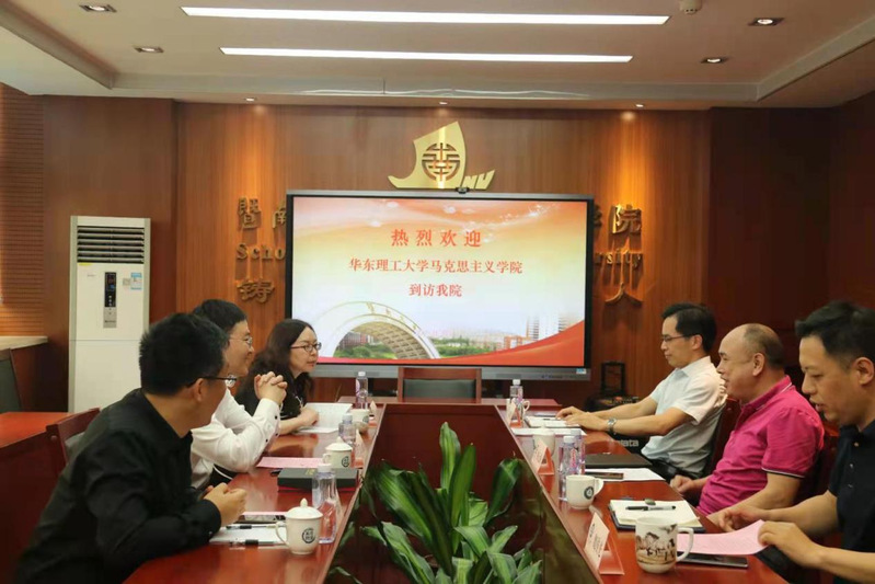 4月19日下午,必赢国际437官网院长杜仕菊一行赴暨南大学察学习。暨南大学必赢国际437官网党总支书记柏元海,党总支副书记、副院长魏传光,副院长陈联俊、办公室主任曾煜东,研究生公共课教研室主任史军,形势与政策教研室主任何小勇共同参加此次座谈会,会议由柏元海主持。
