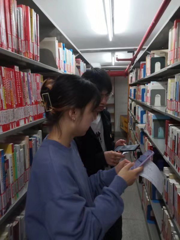 蔡晓婷:在找书的过程中,我更好地了解了今后相关阅读的书籍有哪些。我们先是小组讨论分配了每个人需要负责查找的书目,然后分头行动,将二楼中文库里找不到的书先用标记标注出来。此后,通过学校图书馆公众号查询这类书籍,若在三楼社科处有的再进行第二次找书,有些在奉贤校区或者确实都已借出的,我们再进行二次标注。在我们的协作互助下,将找出的书以及未找到的书进行了核查,无误之后再和图书馆老师对接,并愉快地和相关负责老师合影留念了,预祝纪检书展顺利举办。