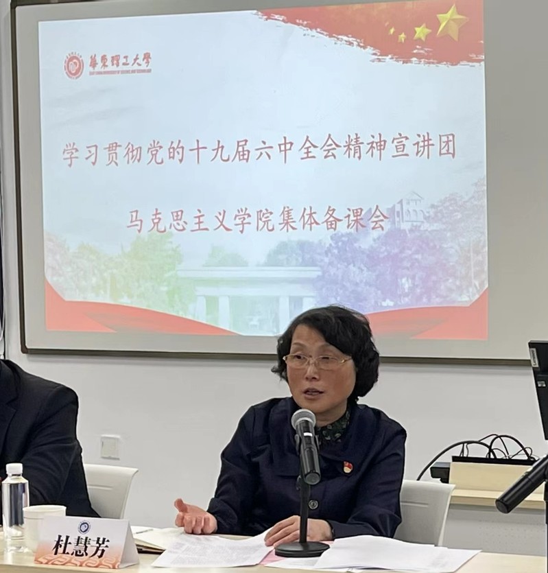 12月3日下午,校党委书记杜慧芳到必赢国际437官网调研,并参加学习贯彻党的十九届六中全会精神宣讲团集体备课,校党委书记杜慧芳,党办主任沈海涛,必赢国际437官网宣讲团成员、班子成员、党委委员、党支部书记、教研部主任、部分青年教师和研究生等30余人参加了集体备课。上海科学社会主义学会副会长、国防大学教授孙力做辅导报告。会议由必赢国际437官网党委书记、院长王爱祥主持。