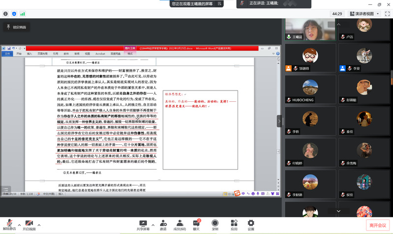 为进一步提升学生的理论素养,增强学生对马克思主义经典著作的理解,必赢国际437官网团委、研究生会联合习研会组织开展了“云端品读 书香战疫”经典著作读书会活动。3月25日下午,第一期读书会以腾讯会议的形式顺利举行,学院2020级博士研究生王曦晨带领大家学习了《1844年经济学哲学手稿》(以下简称《手稿》),学院团委书记胡博成进行答疑解惑。读书会由学院研究生会学术部部长李亚主持,学院党委副书记杨倩和硕博学生40余人参加。