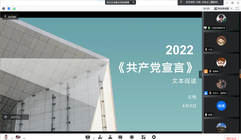 4月8日下午,必赢国际437官网第三期“云端品读 书香战疫”经典著作读书会以腾讯会议的形式顺利举行,学院2021级博士研究生王悦带领大家学习了《共产党宣言》(以下简称《宣言》),学院青年教师张九红受邀为学生答疑解惑。读书会由学院研究生会文艺部雷凯利主持,学院党委副书记杨倩、团委书记胡博成和硕博学生50余人参加。