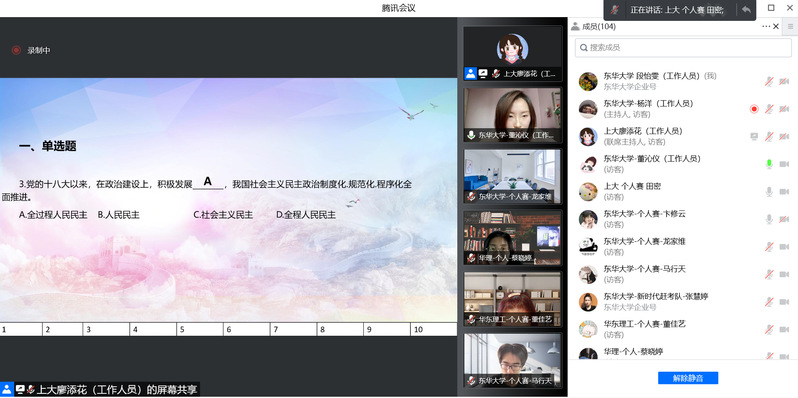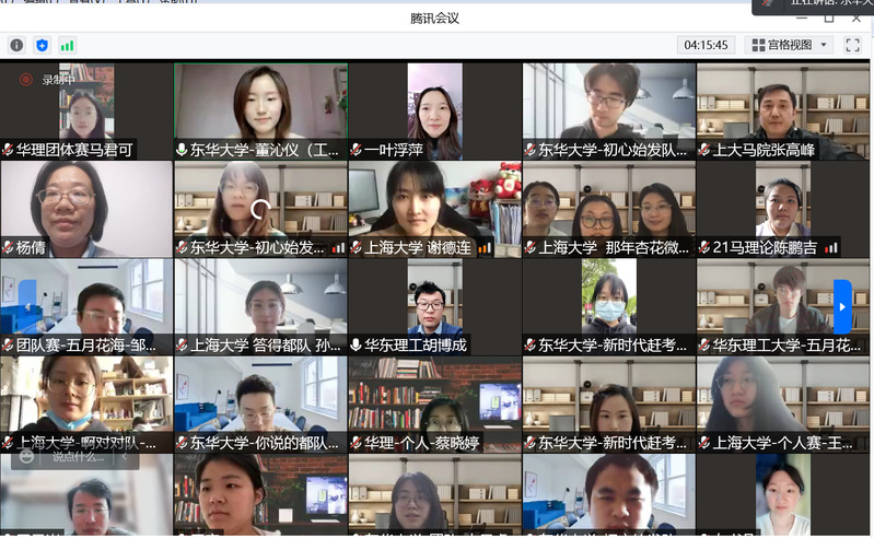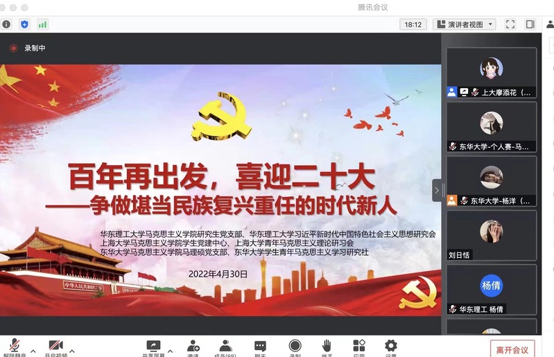 在五四青年节到来之际,为深入学习贯彻习近平总书记在中国人民大学的重要讲话精神,推动党史学习教育常态化长效化,4月30日,由必赢国际437官网、东华大学、上海大学三所高校必赢国际437官网联合组织的“百年再出发,喜迎二十大——争做堪当民族复兴重任的时代新人”党史专题知识竞赛成功举办。必赢国际437官网党委副书记杨倩、团委书记胡博成,东华大学必赢国际437官网党委书记戴叶萍、青年教师白虎、任园,上海大学必赢国际437官网党委副书记、副院长张高峰,学生党建中心主任、研究生辅导员谢德连出席活动。来自三所高校马院的12名个人赛选手、9支团体赛代表队及三校百余位青年学子参与其中。