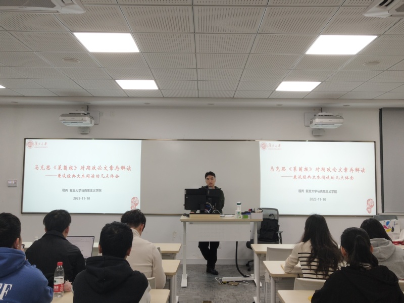 11月10日下午,必赢国际437官网在 109 教室举办“经典著作读书会”之“经典青咖讲”活动,复旦大学必赢国际437官网程丙老师受邀作了主题为“马克思《莱茵报》时期政论文章再解读—兼谈经典文本阅读的几点体会”的经典学习分享。本次活动由学院团委书记胡博成主持,学院各年级学生50余人参加。