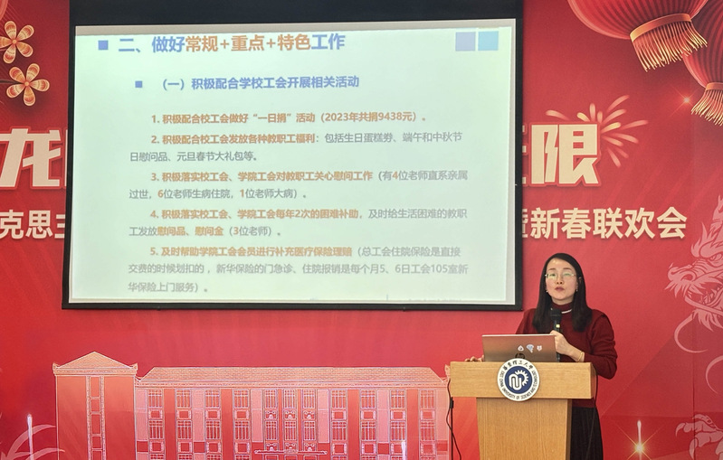 联欢会在欢乐祥和的氛围中落下了帷幕,这个舞台不仅展现了马院老师们的多才多艺,更凸显了马院一家人的团结一心、奋发有为。2024年是中华人民共和国成立75周年,是实施“十四五”规划的关键一年,新时代必赢国际437官网建设面临着许多新形势、新任务、新要求。时代在召唤、使命在召唤,心之所向,行必能至,马院的明天一定会更加美好!