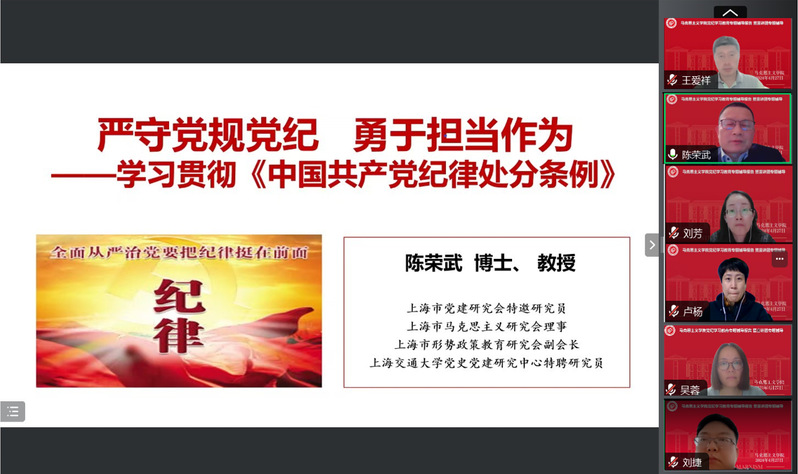 学院此次特邀上海市党建研究会特邀研究员、上海市马克思主义研究会理事、上海市形势政策教育研究会副会长、上海交通大学党史党建研究中心特聘研究员陈荣武教授作题为《严守党规党纪 勇于担当作为——学习贯彻<中国共产党纪律处分条例>》的专题辅导报告。