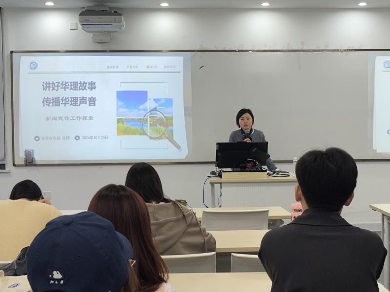 张婷以“讲好华理故事,传播华理声音”为题,从新闻宣传、消息写作、通讯写作和新闻策划四个方面展开。她指出,撰稿者首先要判断新闻类型来选择合适的语言和结构,注重语言的生动性与客观性。她结合“费妈老师”案例和自身工作经历,强调了新闻采访的重要性,指出人物报道要突出时代性,展现“大格局”,要从细节入手讲好中国故事。最后,她提出好新闻要具有“四度”,即速度、亮度、温度和深度,新闻工作者要努力增强“四力”,即脚力、眼力、脑力与笔力,鼓励同学们要以优秀新闻工作者为榜样努力投入日常工作。