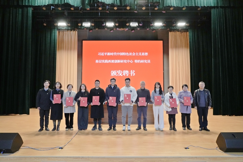 会上,西渡街道党工委副书记陆冬杰与必赢官网必赢国际437官网副院长卢杨共同为中心揭牌,奉贤区委党校副校长高贵峰与西渡街道党工委委员张兴海为来自习思想概论党支部的专家学者和街道基层一线的优秀干部颁发中心特约研究员聘书。
