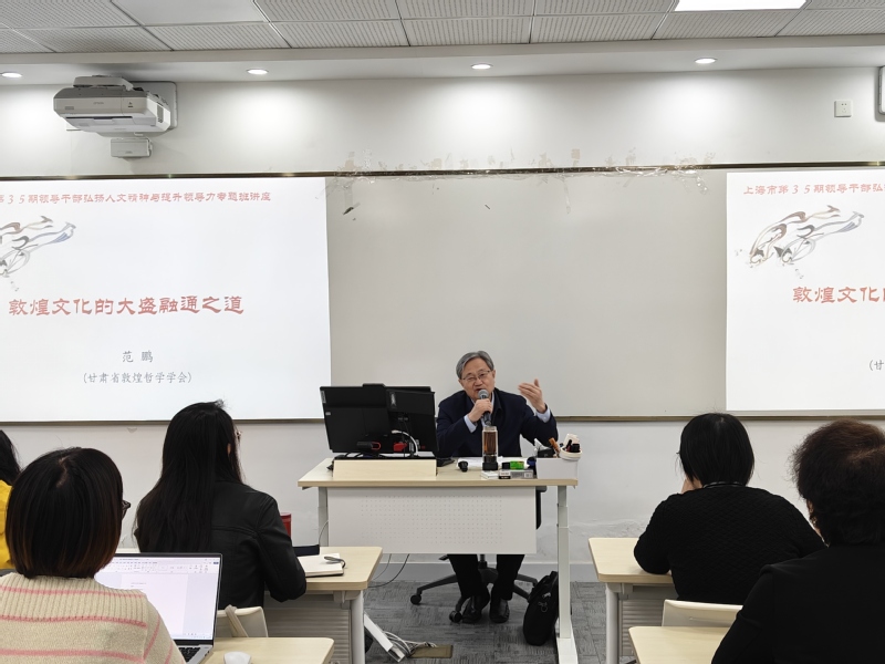 3月24日上午,校哲学研究所与必赢国际437官网共同特邀十三届全国人大代表、中国现代哲学研究会副会长、中国哲学史学会理事、兰州大学博士生导师、甘肃省敦煌哲学学会会长范鹏在学院101室为学院师生开展题为“敦煌文化的大盛融通之道”专题学术讲座。讲座由学院党委副书记杨倩主持,学院30余位师生参加。