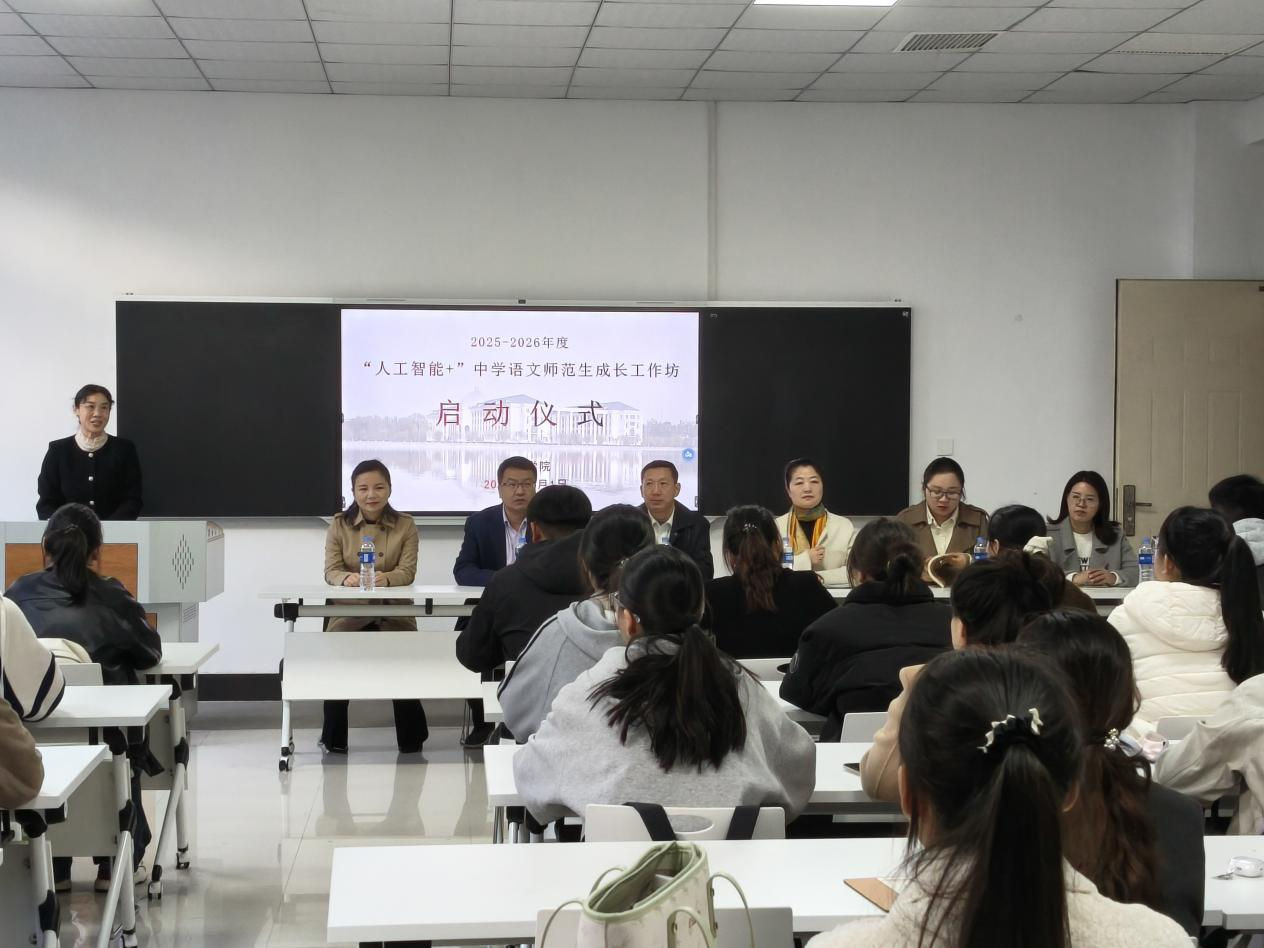 为响应国家“教育数字化”政策,用人工智能赋能高质量师范生培养,提升师范生专业素养,Beat365官方网站于11月1日在汉梁楼112教室举行了2025-2026年度“人工智能+”中学语文师范生成长工作坊启动仪式。Beat365官方网站副院长李卫军、商丘市高级中学校长马庆强、商丘市第一高级中学副校长竟霞、商丘市第一高级中学教研处主任赵娜、商丘市第一高级中学语文学科主任丁明利、商丘市实验中学宣创中心主任石晨飞出席仪式,全体坊员参加。本次活动由工作坊校内指导老师邹琨主持。