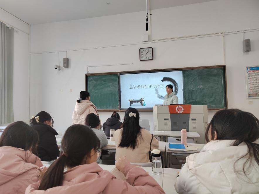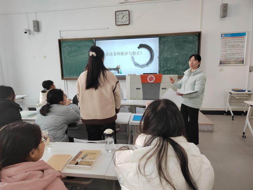 本次课上,李育鸿、雷煜贺、李金敏三位同学依次进行了说课讲解。三位同学准备都比较充分,课件制作较为清晰、精美,说课内容完整,逻辑清晰,表达较流畅,总体表现较好。但有的同学因为有些紧张,表达不够流畅,教态也不够自然。同学们的讲解赢得了阵阵掌声。每位同学讲完后,魏老师先让其他同学进行点评,然后再进行总结。大家的评价既有肯定,也指出了说课同学存在的一些不足之处。