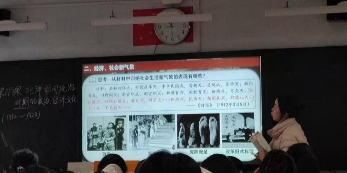 课堂上,授课教师以“新旧思想的碰撞与近代思想演进”为核心,将北洋军阀统治时期的思想文化发展作为教学重点。导入环节通过史料,引出“思想文化何以发生剧变”的核心问题,为新文化运动的讲解做好铺垫;在新文化运动的教学中,教师回归课本史料,以陈独秀的论述为切入点,引导学生探究运动开展的背景与目的,借助丰富图片直观呈现“进步思想”与传统礼教的“新旧交锋”,并联系初中历史知识与学生展开互动,将传统文化与民主思想的冲突具象化,课堂氛围生动活跃。授课过程中,教师还巧妙关联维新变法、辛亥革命等前期思想解放运动的知识点,梳理出近代思想演进的脉络。在材料分析与评价环节,着重引导学生用一分为二的辩证思维看待新文化运动的影响,同时注重培养学生的时空观念与全球视野,让学生深刻理解这一时期思想文化变革的时代意义。