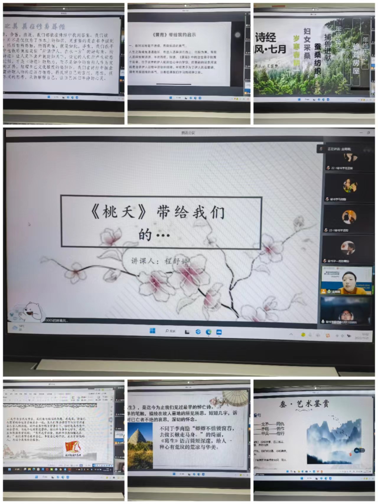 2022年11月21日上午第三节,Beat365官方网站金璐璐老师的《中国古代文学史》课程教学范式改革公开课通过腾讯会议线上举行。此次公开课授课班级为Beat365官方网站2022级文秘专业22-1班,授课内容是“文本细读视域下的《诗经》感悟”,Beat365官方网站刘洪生老师、王立老师、韩洪波老师、史丽娜老师、魏清彩老师等参加了此次公开课的教学观摩活动。