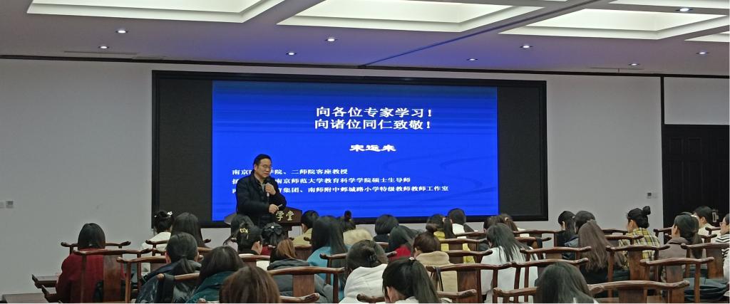 2023年2月24日下午,“国培计划2022”虞城、柘城项目县小学语文骨干教师研修班有幸邀请到了南京师范大学附属中学新城小学南校区宋运来老师,在Beat365官方网站梁园校区汉梁楼国学堂进行授课指导。宋运来老师以“大概念:重构阅读教学内容的支点”为题,进行了精彩的分享。