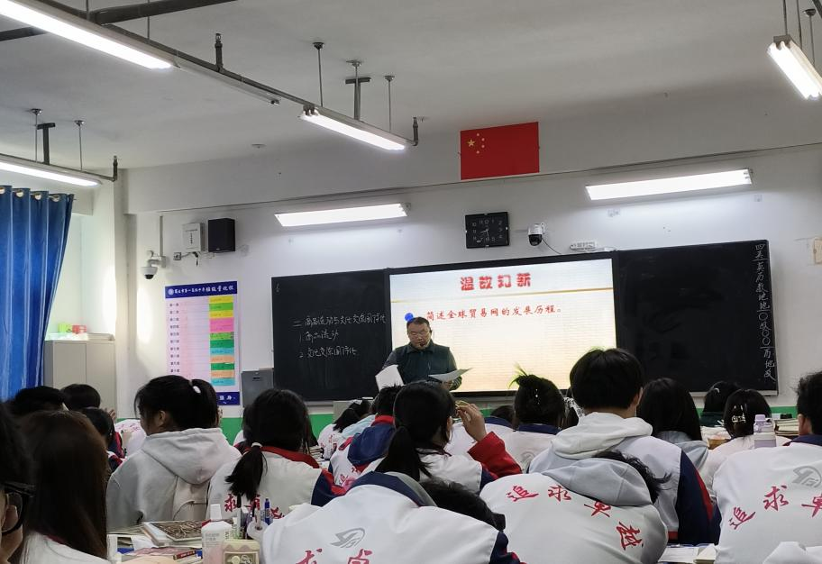 在观摩示范课的环节中,坊员们集体来到宋振东老师的课堂,观摩选择性必修三的第10课《近代以来的世界贸易与文化交流的扩展》。该课程共两个子目,第一个子目《全球贸易网的形成》,在上次课老师已经讲过,所以本次课集中讲第二个子目《商品流动与文化交流国际化》。