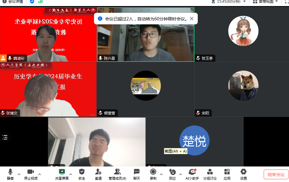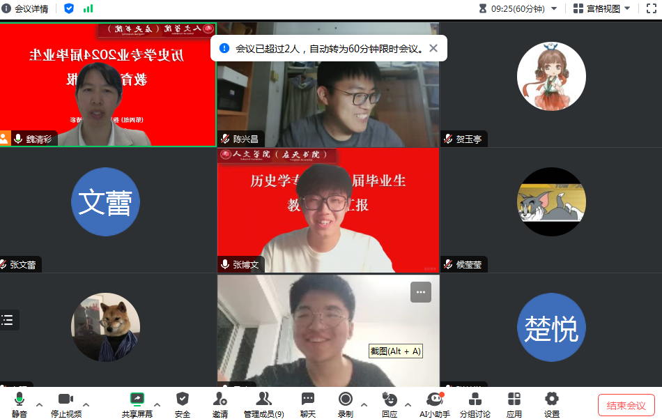 2024年5月9日晚,2020级历史学专业教育实习第四小组成员在指导老师魏清彩的带领下进行了教育研习活动。由于部分同学不在学校,本次活动借助腾讯会议以线上交流的方式进行。