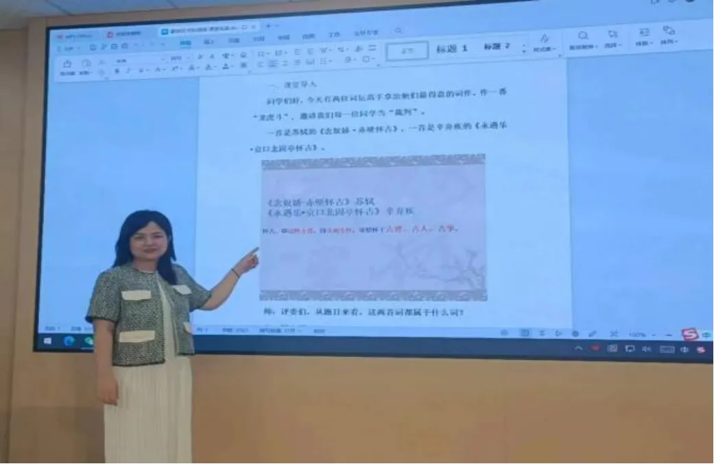 首先,王老师进行了《念奴娇·赤壁怀古》《永遇乐·京口北固亭怀古》的对比阅读的讲授,由浅入深地对两首词的异同以及主题进行讲解,传授了古诗文对比阅读的教学方法以及微型课的教学要素,为坊员的古诗文微型课教学提供了设计思路。接着,针对教学内容的设置,王老师解答了坊员们提出的问题,师生对如何设置教学环节进行了深入的交流和探讨。最后,王老师布置了下一次跟岗实践的任务,要求坊员们进行古诗文的微型课教学设计和课堂展示。
