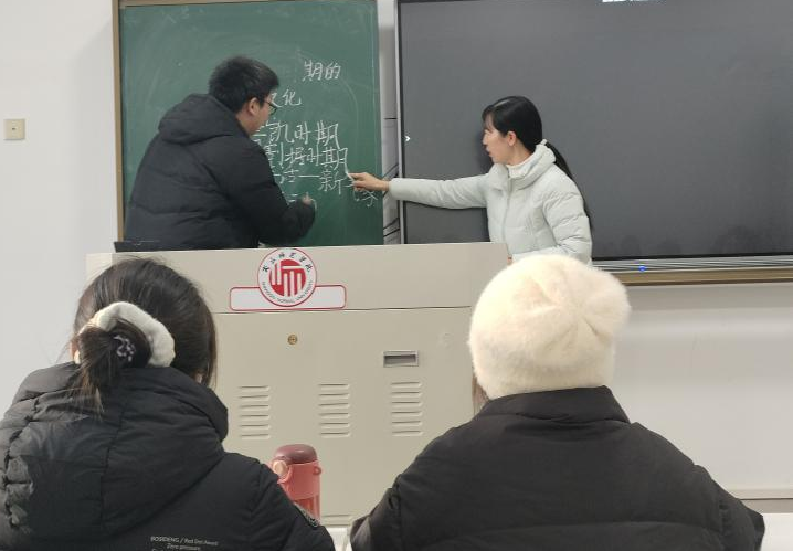 说课流程完整、详细,课件制作较清晰。同学们的讲解赢得了阵阵掌声。在每位或每小组同学讲完后,魏老师先让其他同学进行点评,然后再综合评价。大家的评价既有肯定,也指出了说课同学存在的一些不足之处。魏老师也会直接上台指导同学们板书写作中存在的小问题以及课件中的不规范、不清晰的地方。而且,魏老师还特别引导大家要注意结合课标进行教材分析、确定重难点,教学过程的设计要突出重难点,教学方法的运用在教学过程中要有体现等。