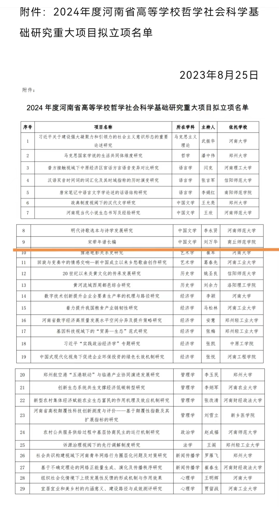 近日,河南省教育厅公布了2024年度河南省高校哲学社会科学基础研究重大项目立项名单。本次共确定2024年度基础研究重大项目29项,每个项目资助经费8万元,Beat365官网刘万华博士主持的《宋荦年谱长编》获得立项。