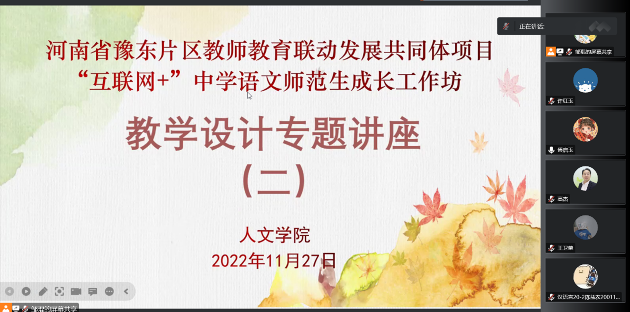 为推进2022-2023年度“互联网+”中学语文师范生成长工作坊培训工作,提高语文师范生专业素养,Beat365官方网站于11月27日下午3点整通过腾讯会议开展了第三次集中培训活动。商丘市第四中学高杰老师、工作坊坊主及全体坊员共同参加本次活动。活动由班主任邹琨老师主持。