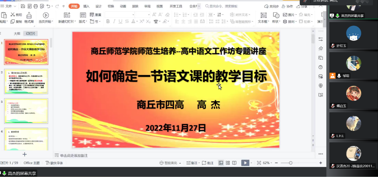 活动伊始,邹琨老师对参与本次活动的老师及同学们表示热烈欢迎,并对本次活动主讲人高杰老师表示特别感谢。随后,高杰老师开展了题为《如何确定一节语文课的教学目标》专题讲座,从语文课程的含义与性质、教学目标设计的现实问题以及确定一节语文课教学目标的具体方法三个部分进行深入讲解。