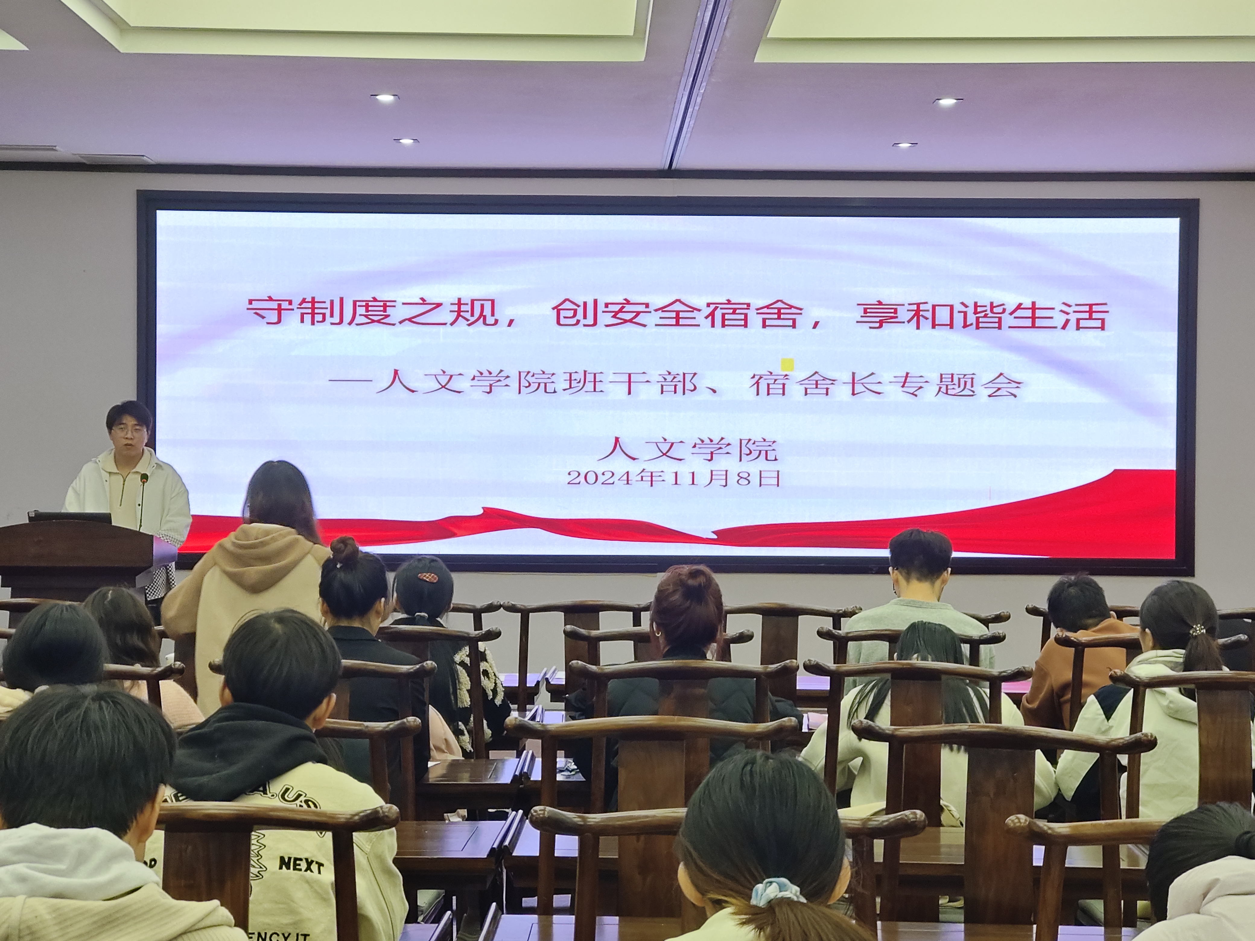王超老师以“守制度之规,创安全宿舍,享和谐生活” 为主题展开培训。他深入剖析了宿舍制度规范的重要性,强调只有严格遵守各项规章制度,才能为创建良好宿舍环境筑牢根基。同时,结合实际案例阐述了宿舍安全隐患的多种表现形式,警醒大家时刻绷紧安全弦,从用电安全到消防安全等方面一一叮嘱。还倡导大家在宿舍中相互包容、理解,营造和谐氛围,如此方能享受宿舍生活。