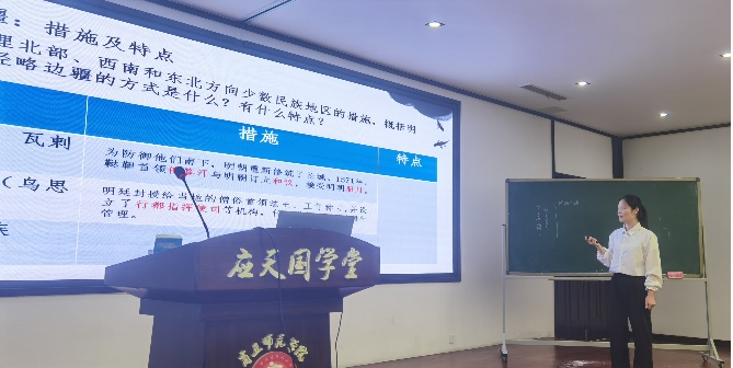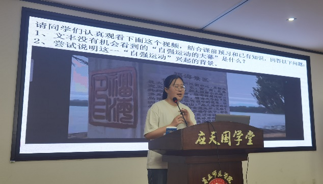 本次成果汇报由薛立芳老师主持开展,经过实习小组组内选拔,共有12名学生参与成果汇报。参与的12名学生按照抽签顺序依次上台进行成果汇报。在授课环节,各汇报学生准备充分,教学过程设计合理,语言表达准确生动,教学方法新颖独特。各汇报同学自然流畅、富有感情的语言表达,端庄大方、挥洒自如的仪态、优美的板书设计彰显出历史学专业学生扎实的教学基本功和热情的实习风采。