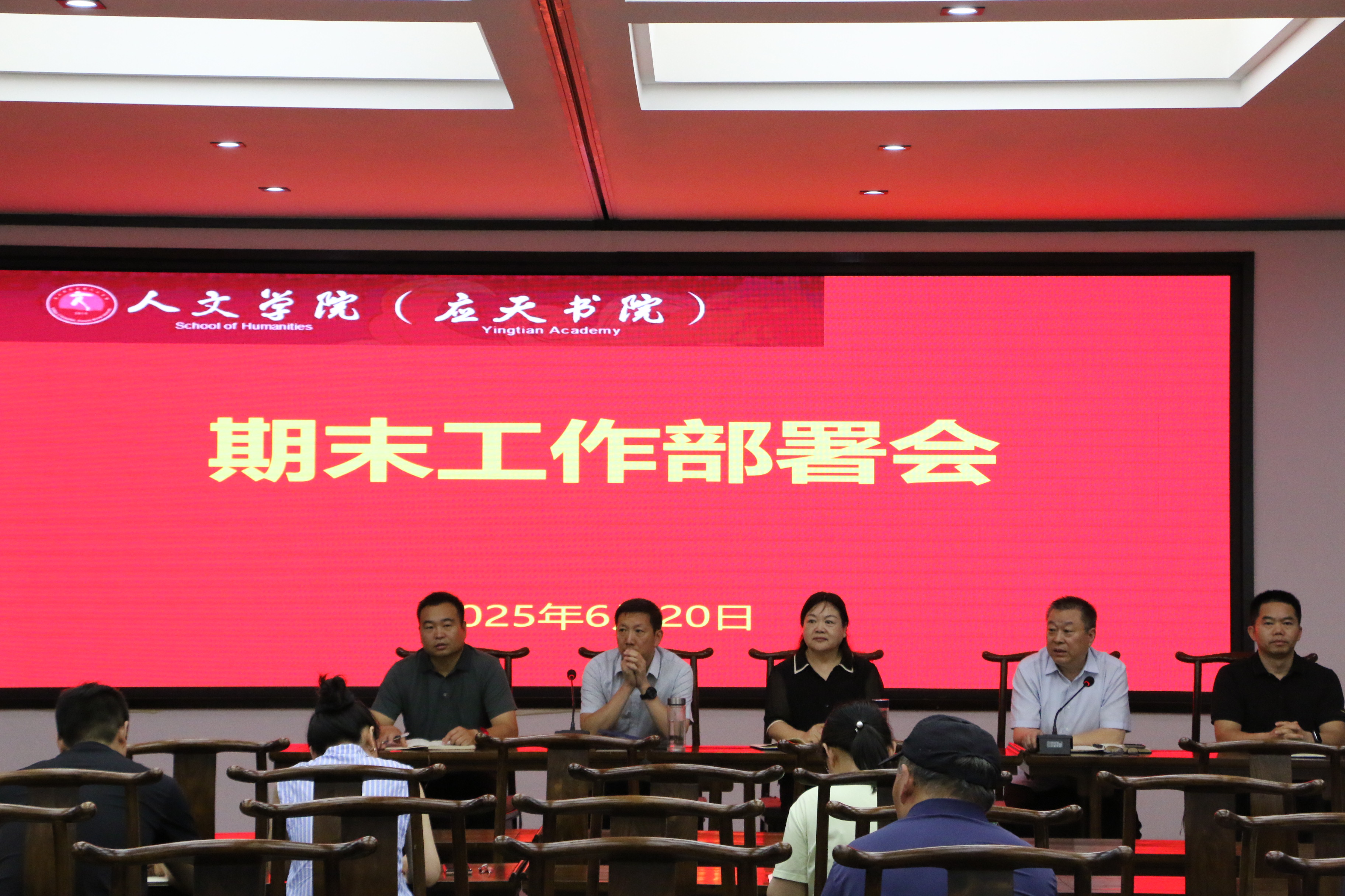 6月20日下午,Beat365官方网站于汉梁楼国学堂召开期末工作部署会议,学院党委书记陈晓明、党委副书记卢忠雷、副院长冯志伟、李卫军、刘万华出席会议,全体教职工参会。