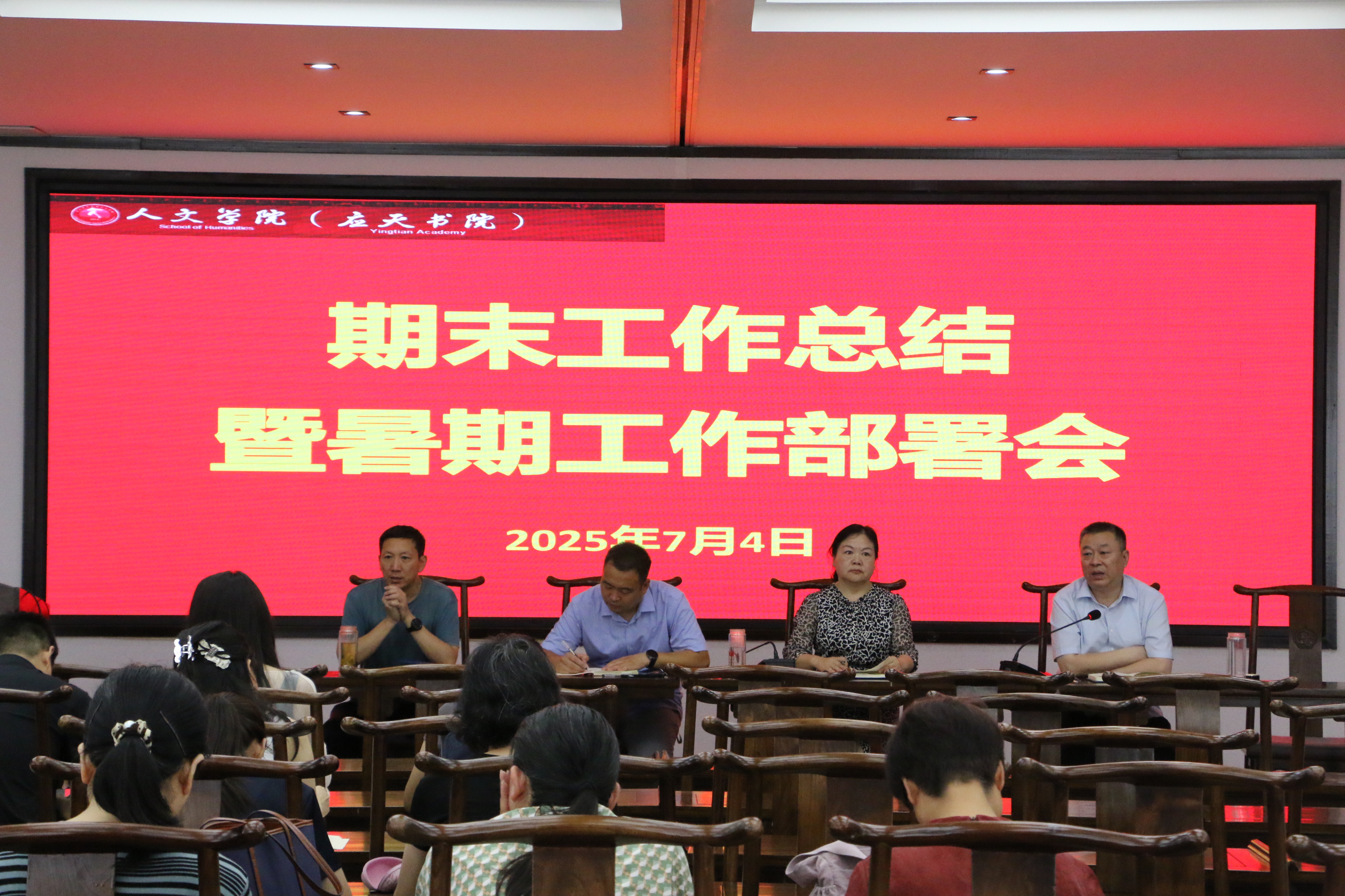 7月4日上午,Beat365官方网站在汉梁楼国学堂召开2024-2025学年第二学期期末工作总结暨暑期工作部署会。学院党委书记陈晓明、党委副书记卢忠雷、副院长冯志伟、李卫军及全体教职工参加会议。会议由学院党委书记陈晓明主持。