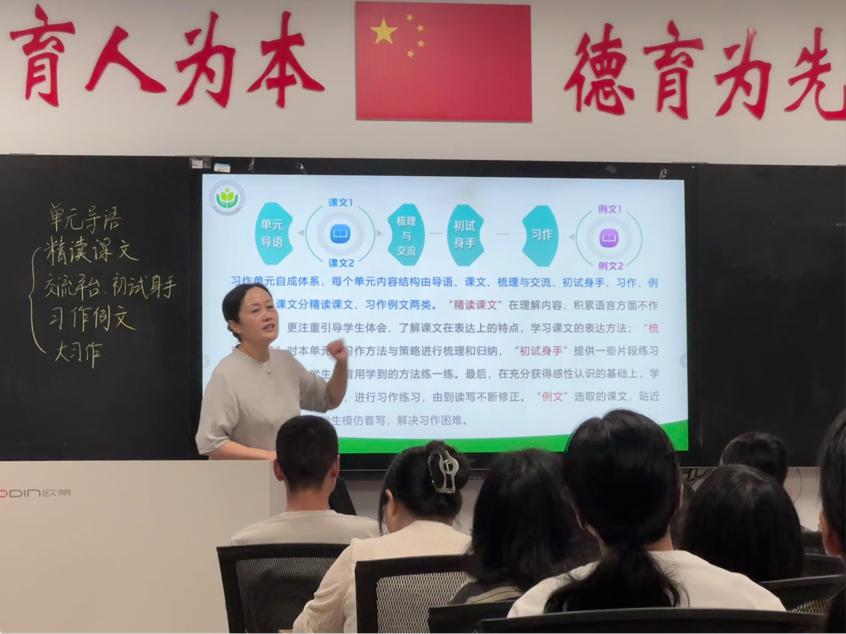 上午,吴玉华老师立足课程理念从“整体观认识课标定位、结构化把握课标内容、抓关键理解课标理念”三个维度进行了系统梳理,并重点阐释了统编教材中习作板块的编排思路和习作例文在呈现顺序上的最新变化,为骨干教师们提供了清晰的教学思路与实践指引。