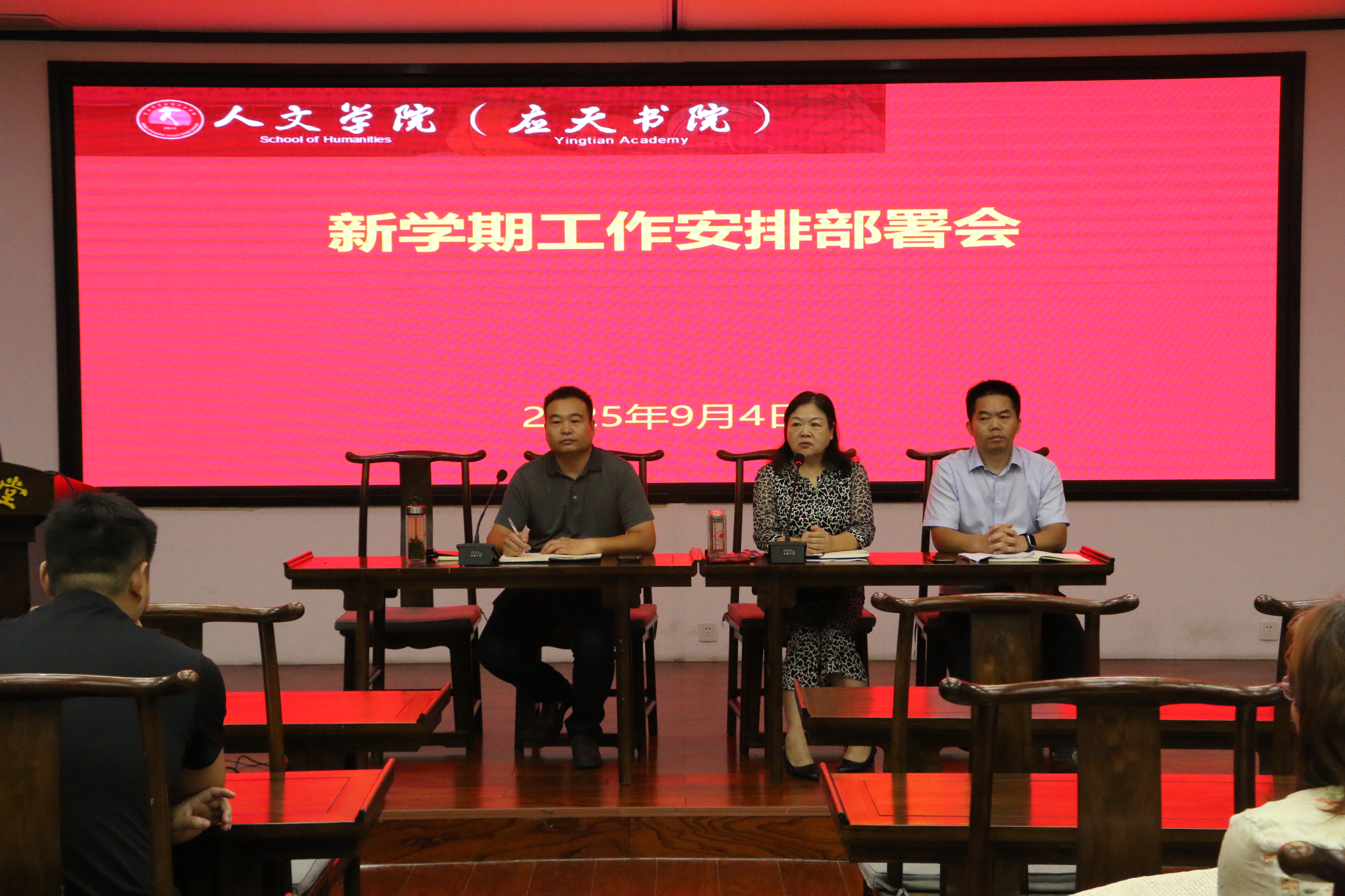 9月4日下午,Beat365官方网站在汉梁楼国学堂召开2025秋季学期工作安排部署会议。学院党委书记陈晓明主持会议,学院全体教职工参加会议。