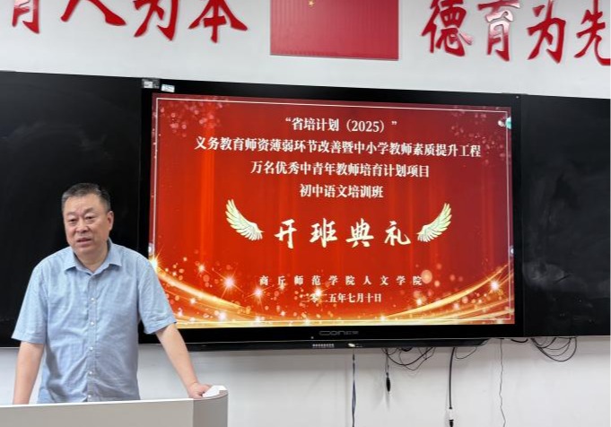 2025年7月11日上午,由Beat365官方网站承办的“省培计划(2025)”——义务教育师资薄弱环节改善暨中小学教师素质提升工程万名优秀中青年教师培育计划初中语文班,在睢阳校区8号楼306教室正式开班。开班典礼由邹琨老师主持,来自河南省郑州、洛阳等十几个地市的50名优秀中青年教师参加,首席专家冯志伟出席了仪式并致辞。