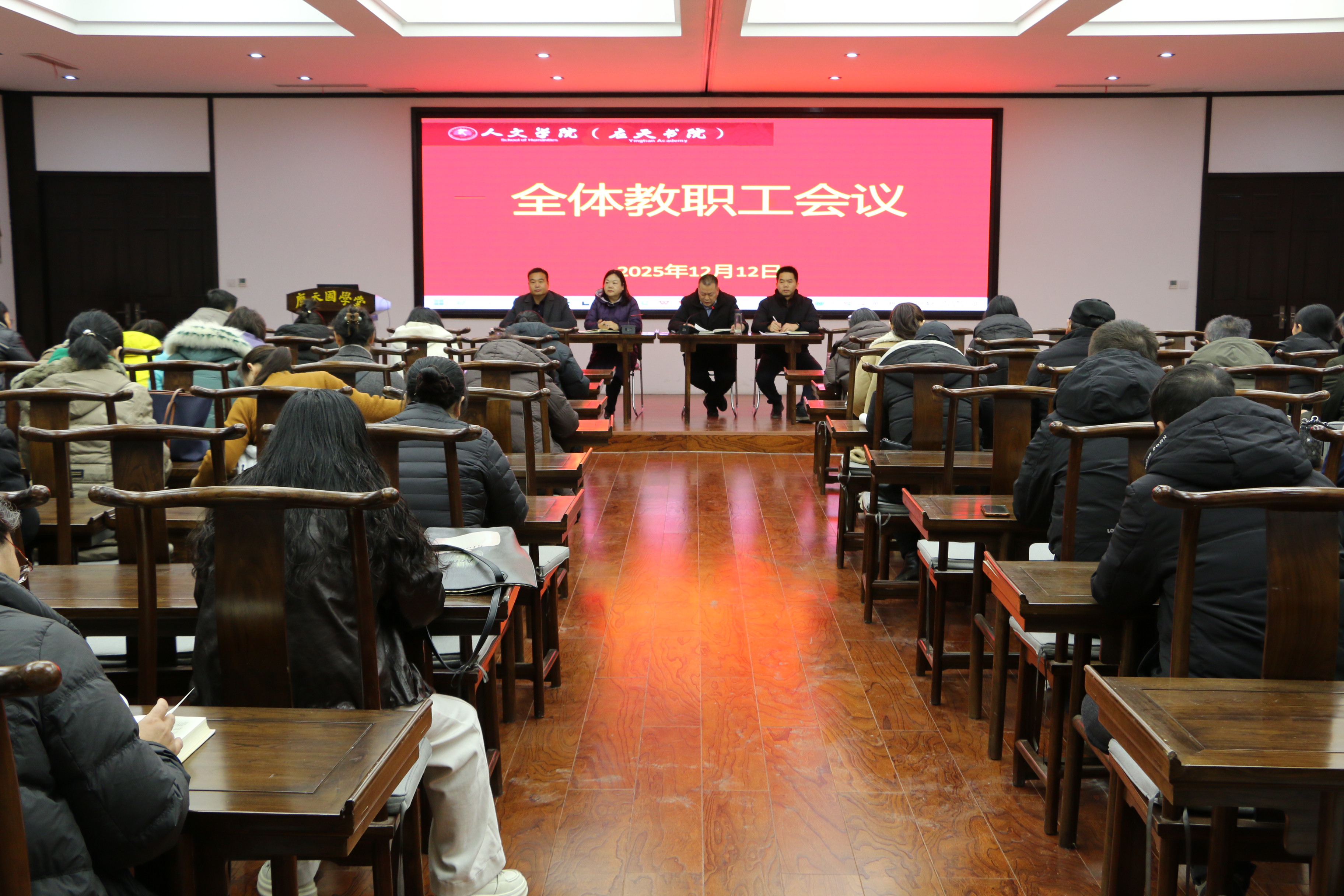 12月12日下午,Beat365官方网站在汉梁楼国学堂召开全体教职工大会,传达学习学校会议精神,部署重点工作。会议由学院党委书记陈晓明主持。