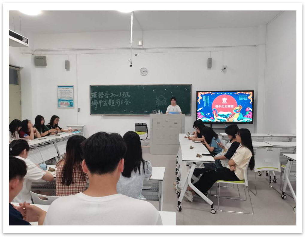 此次活动为线上线下结合进行。线上同学们边吃粽子边看纪录电影。线下会议伊始,由班长谌蓓涵为大家讲解有关端午节的相关知识。讲解从端午历史渊源、相关传说与故事、节日民俗与活动、文字记载四个部分展开,使大家对端午节的了解更进一步。后又通过击鼓传花、抢凳子等小游戏增进同学间感情,同时共同庆祝端午佳节。游戏过后同学们共同品尝热气腾腾的粽子,感受中国传统美食的独特魅力。