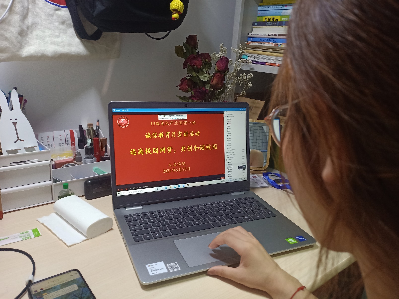 历史班由班长组织学生在汉梁楼224教室开展活动,主题班会分为学习诚信楷模人物事迹、现场自主发言和班干部宣讲三个环节。秘书和文化产业管理专业学生通过线上会议的方式召开主题班会,学生们会上积极发言,会后纷纷撰写心得体会,表达自己远离校园网贷,诚实守信做人的决心和态度。
