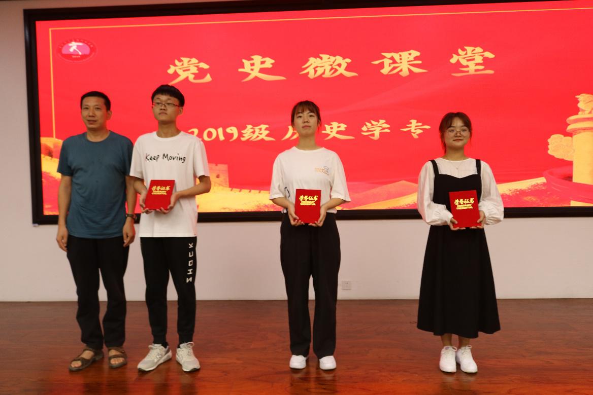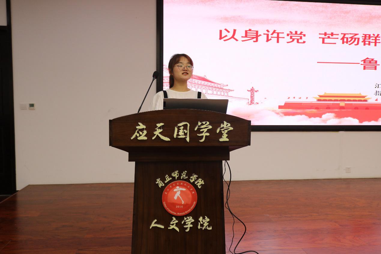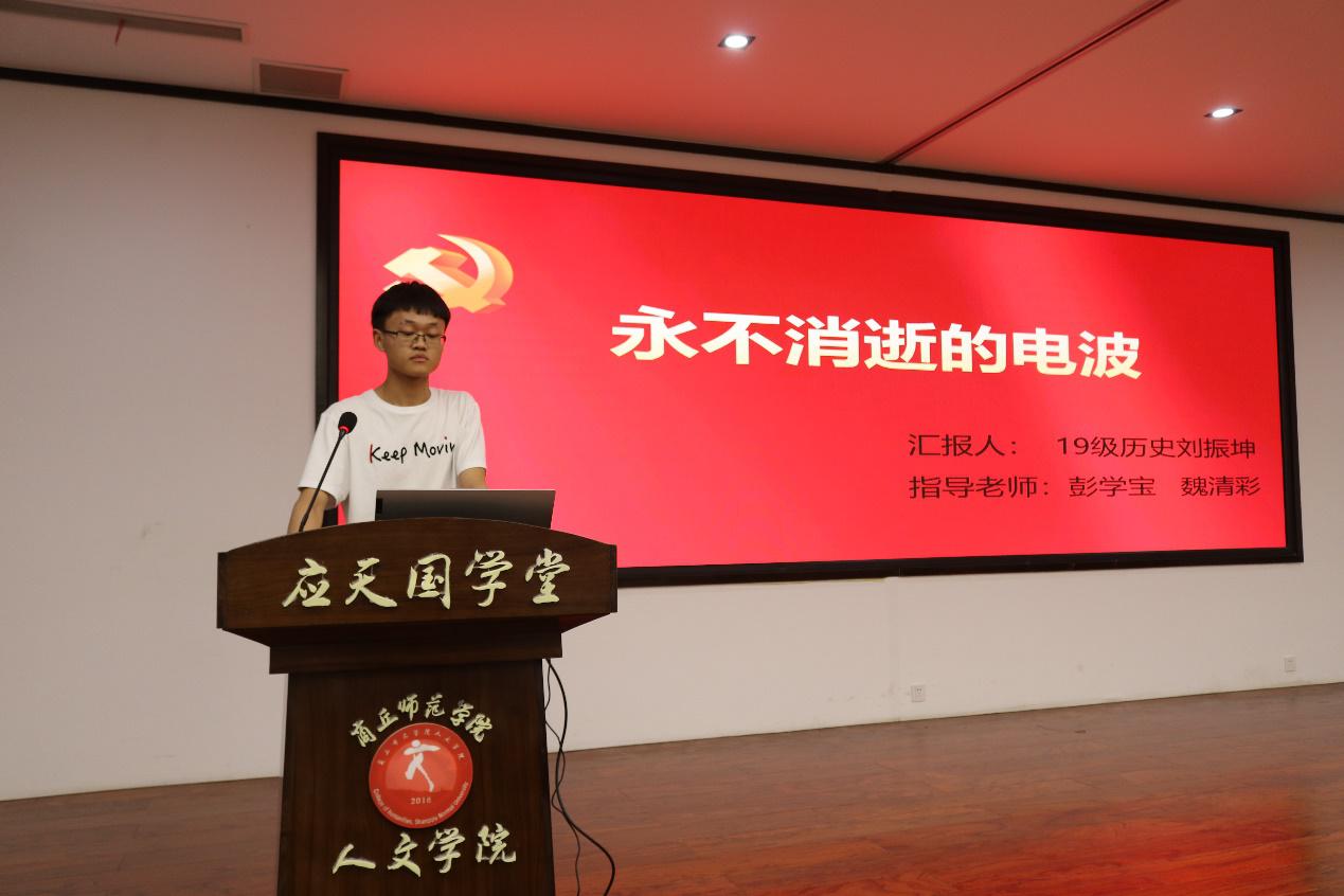 在党史微课堂环节,2019级历史国学班闫菁蕊、铁媛媛、刘振坤同学分别以《以身许党芒砀群山铸忠魂——鲁雨亭》《“铁肩担道义,妙手著文章”——李大钊》《永不消逝的电波--李白》为题,深情讲述先烈故事,追忆先辈革命事迹,缅怀逝者,激励大家继承革命理想,坚定不移为实现民族复兴的伟大梦想付出自己的努力。