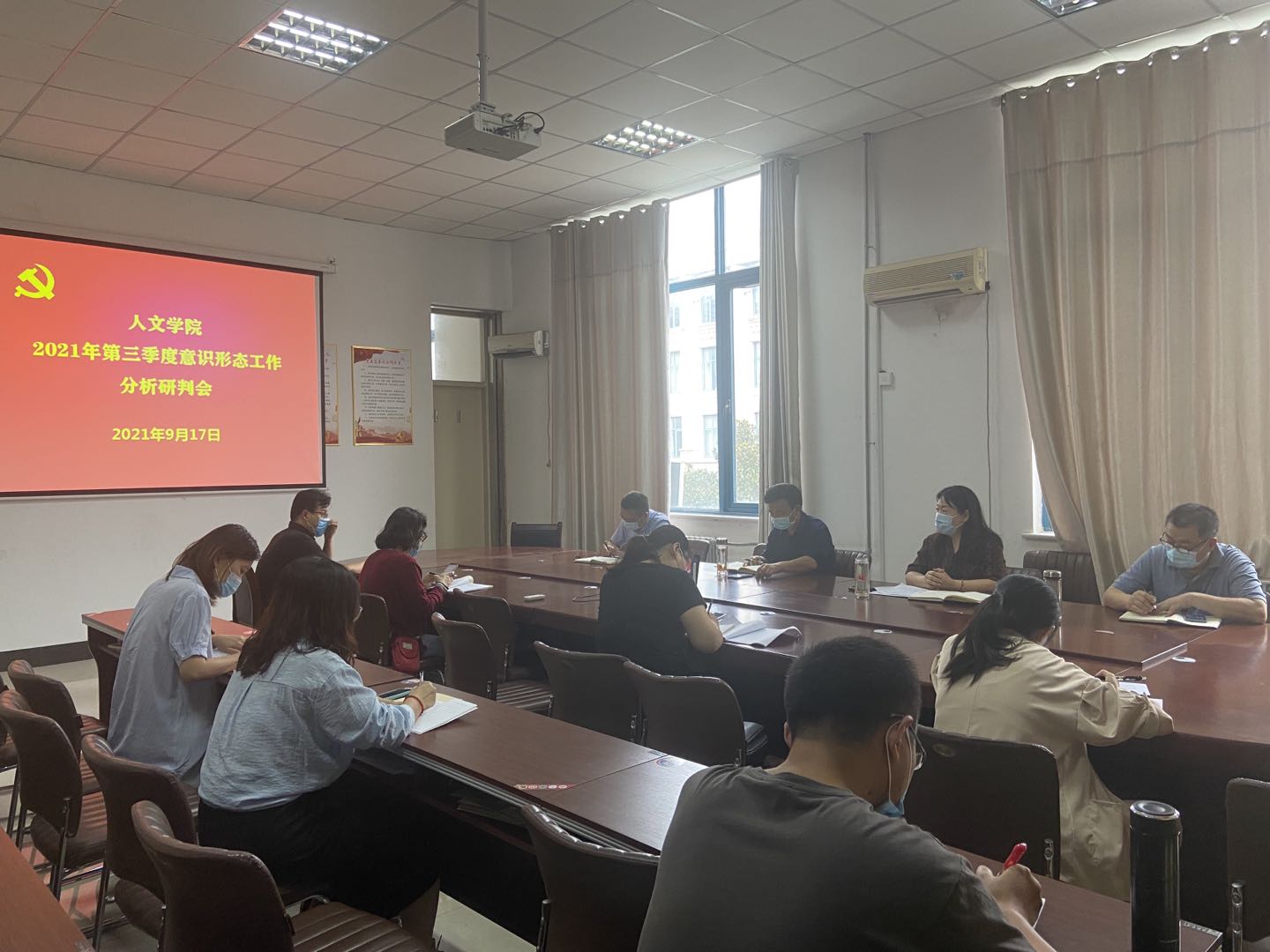 9月17日下午,Beat365官方网站在梁园校区汉梁楼208会议室召开2021年第三季度意识形态工作分析研判会。学院党委书记陈晓明、院长高建立、党委副书记卢忠雷、副院长冯志伟、各教工党支部书记和学院全体辅导员参会,会议由陈晓明主持。