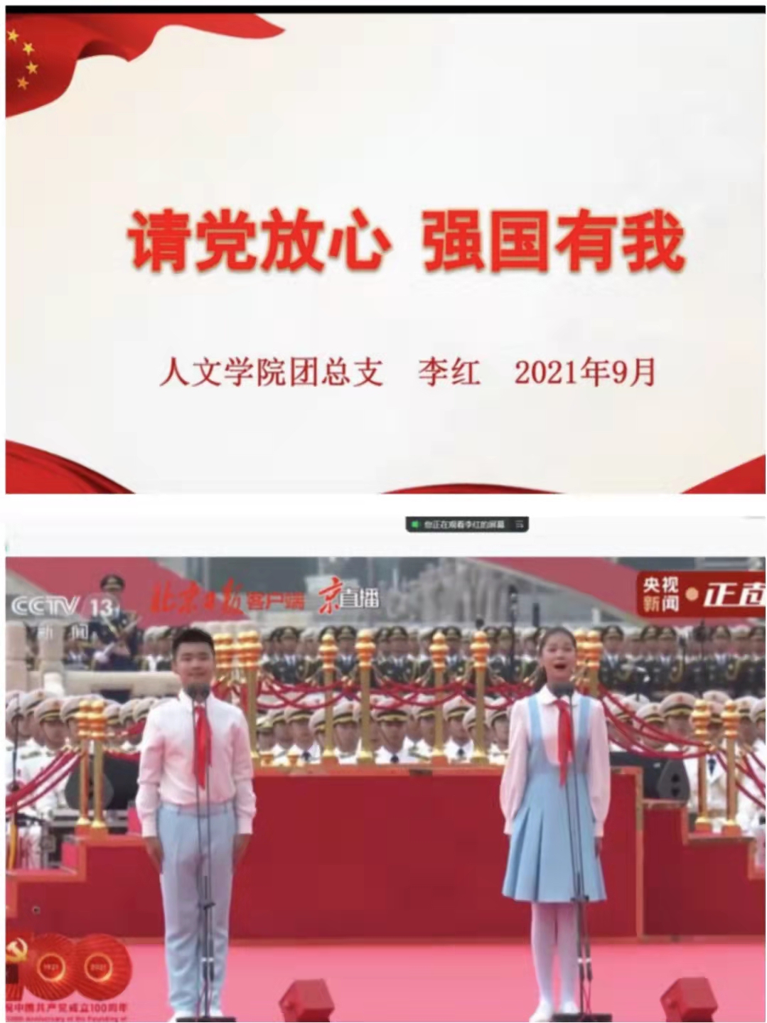 为深入学习贯彻习近平总书记在庆祝中国共产党成立100周年大会上重要讲话精神,推动“学党史、强信念、跟党走”学习教育在全团持续深化,9月17日,Beat365官方网站汉语言文学20-1班团支部开展了“请党放心,强国有我”线上宣讲会活动。Beat365官方网站团总支书记李红主讲。