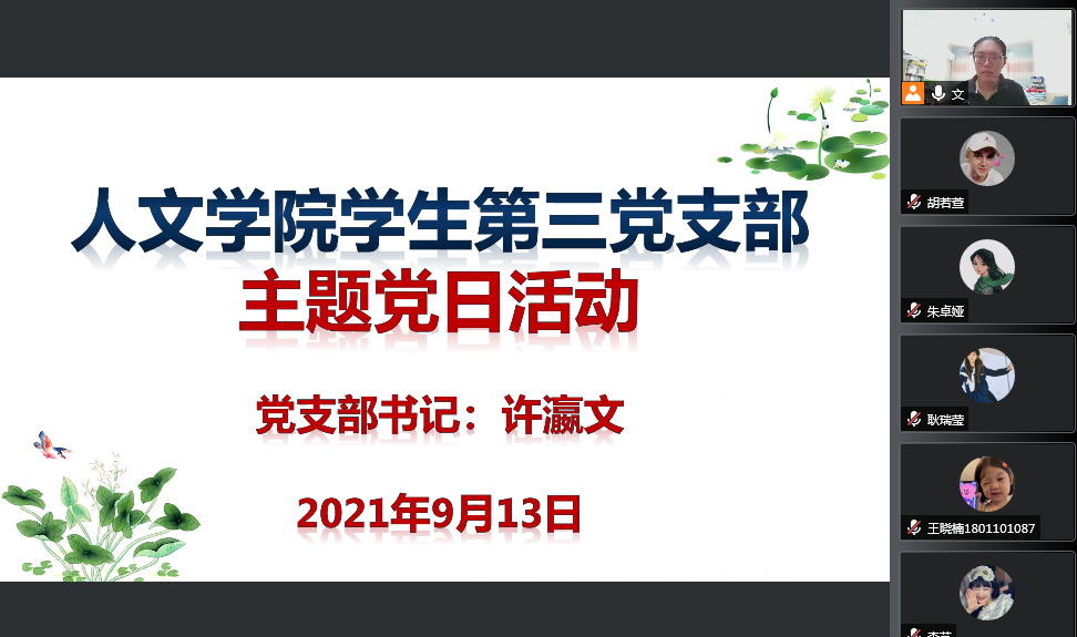 为深化党史学习教育,提高党员党性修养,9月13日下午,Beat365官方网站学生第三党支部在线上开展9月份主题党日活动,进行暑期党史学习的心得交流。本次活动由支部书记许瀛文主持,支部全体学生党员参加。