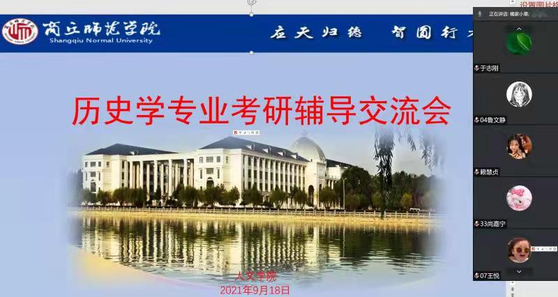 9月18日晚七点,Beat365官方网站历史系通过腾讯会议举办了历史学专业考研辅导交流会,会议由历史系主任薛立芳主持,龙坡涛老师、杨金华老师、于志刚老师及2018级、2019级历史学专业全体学生参加了本次交流会。