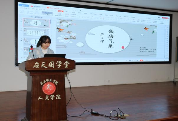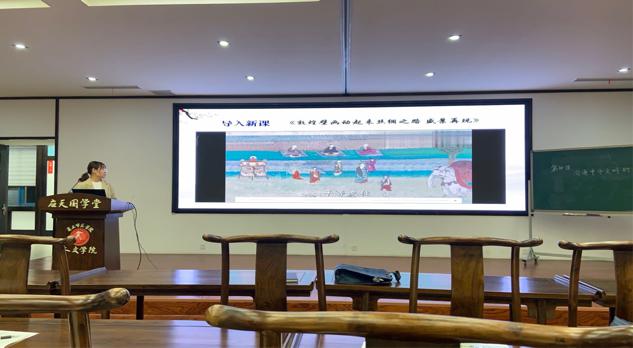 汇报过程中,各参与汇报同学依次上台结合PPT进说课讲解,并准备了才艺展示。同学们镇定从容、思路清晰,从教材、学情、教学方法、教学过程及板书设计等方面入手,全面地展示自己准备的说课内容。