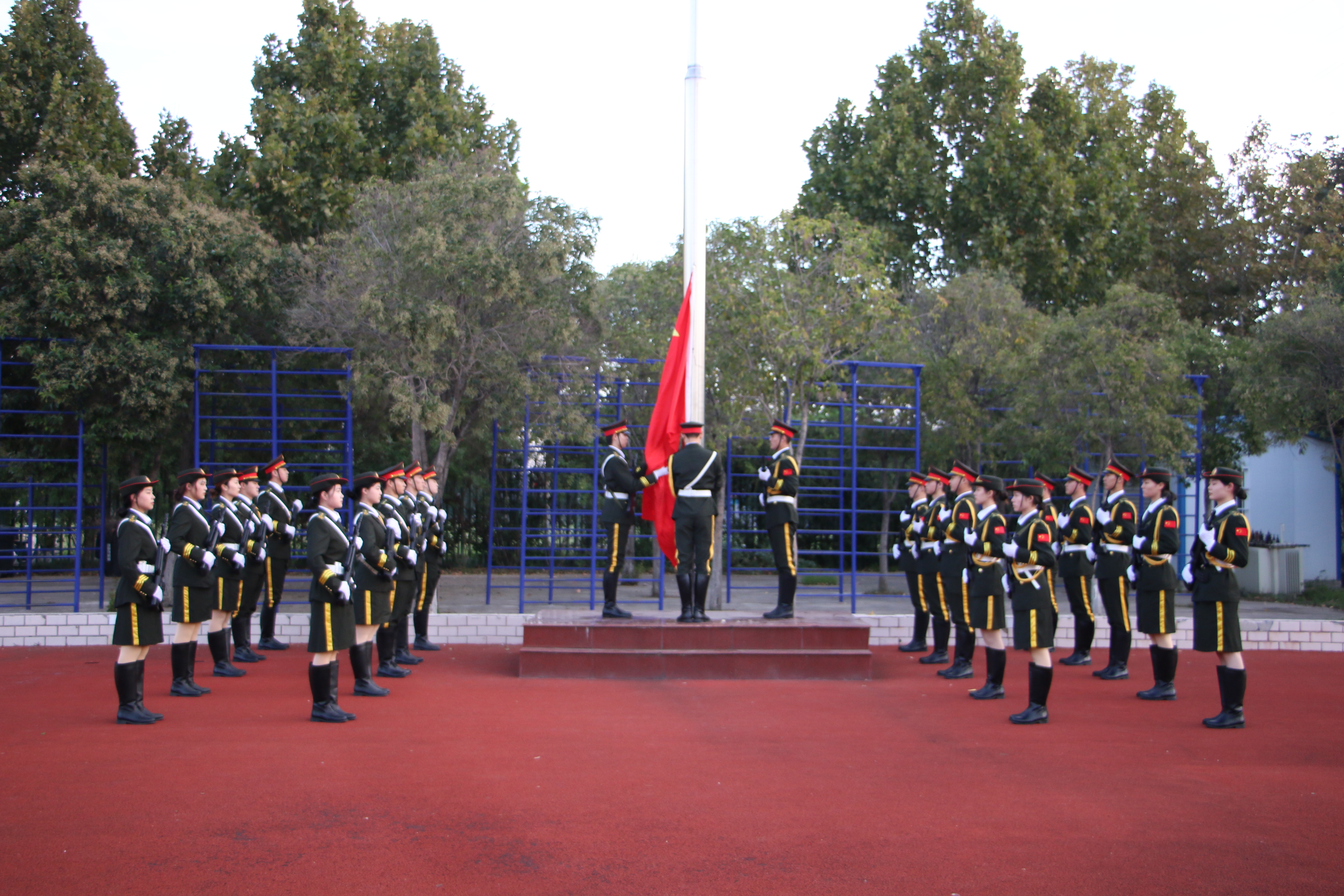 在全体师生的注目礼下,英姿飒爽的国旗队队员迈着铿锵的步伐护送着鲜艳的五星红旗进场。伴随着《义勇军进行曲》的响起,鲜艳的五星红旗冉冉升起,迎风高高飘扬。