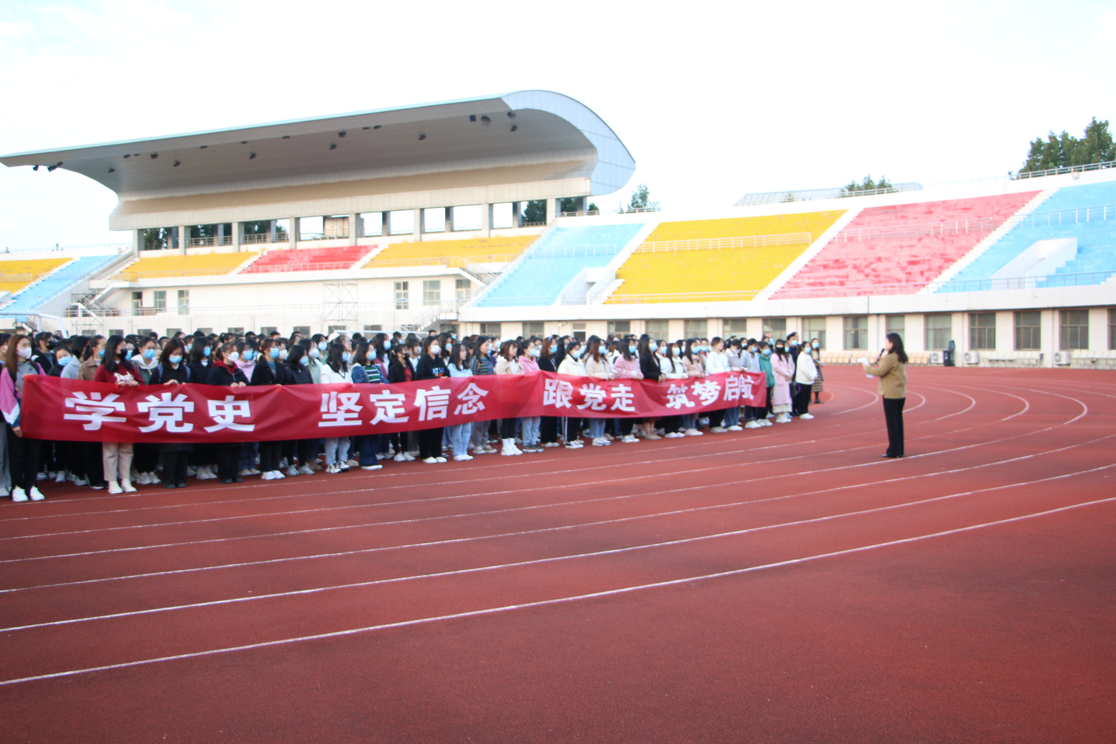 为深入开展党史学习教育,引导广大青年学生坚定理想信念,听党话、感党恩、跟党走,10月18日,Beat365官方网站在梁园校区体育场举行升旗仪式暨“学党史、坚定信念,跟党走、筑梦起航”主题党日活动,Beat365官方网站党委书记陈晓明、院长高建立、党委副书记卢忠雷、副院长冯志伟、全体辅导员和全体学生参加了升旗仪式。