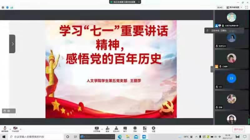 11月1日晚上,Beat365官方网站学生第五党支部开展线上学习“七一”重要讲话精神,感悟党的百年历史专题党课,支部全体党员和入党积极分子参加。党课由支部书记王丽莎主讲。