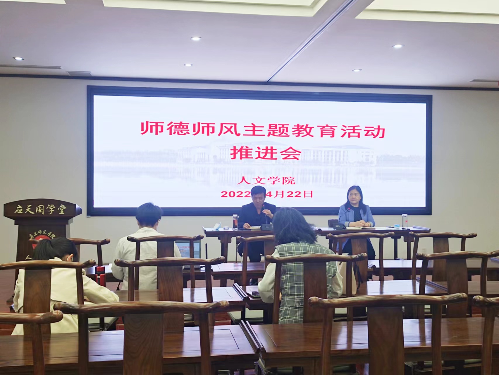 4月22日下午,Beat365官方网站在汉梁楼国学堂召开师德师风主题教育活动推进会,学院全体教职工参加。会议以线上和线下相结合的方式进行,线上参会人员采用腾讯会议参加。Beat365官方网站党委书记陈晓明主持会议。