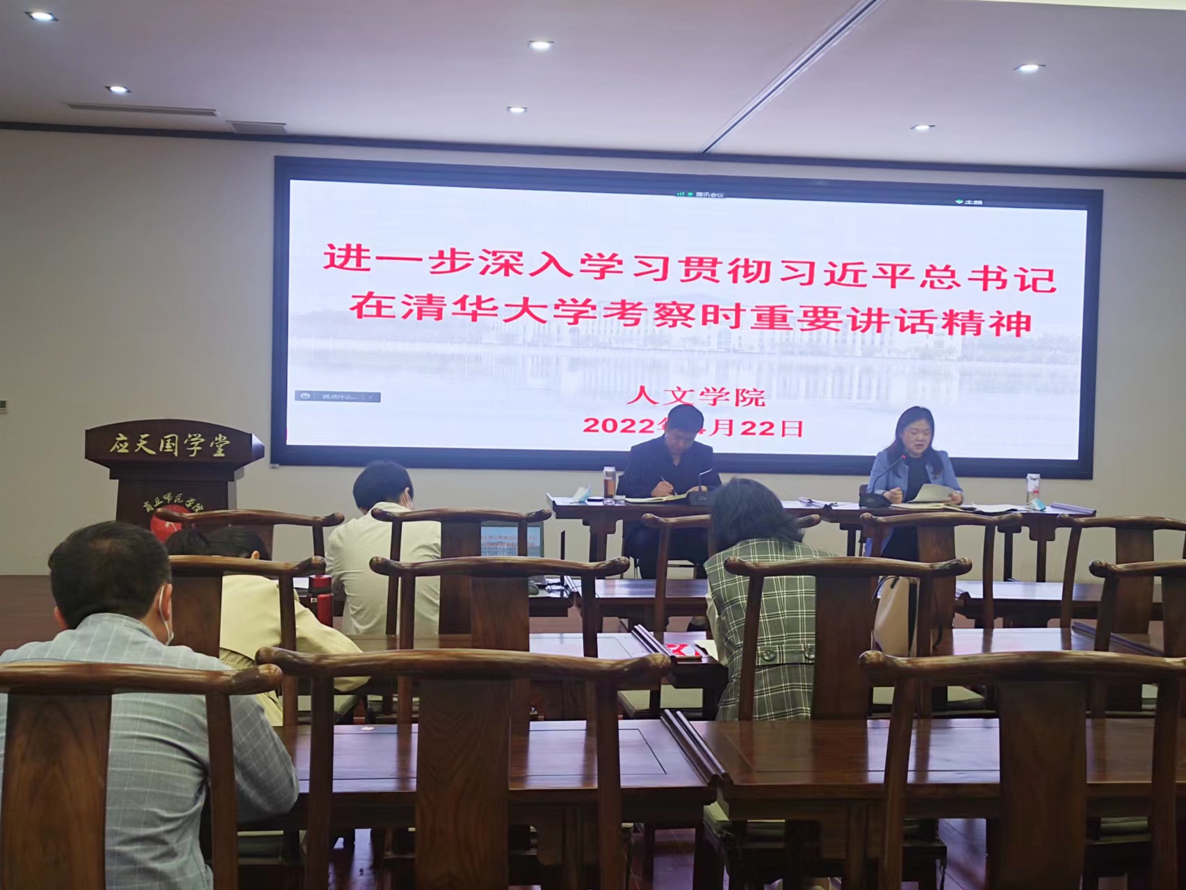 为进一步统一思想、提高认识,4月22日,Beat365官方网站在汉梁楼国学堂召开深入学习贯彻习近平总书记在清华大学考察时的重要讲话精神会议,学院全体教职工参加会议。会议以线上和线下相结合的方式进行,线上参会人员采用腾讯会议参加。Beat365官方网站党委书记陈晓明主持会议。