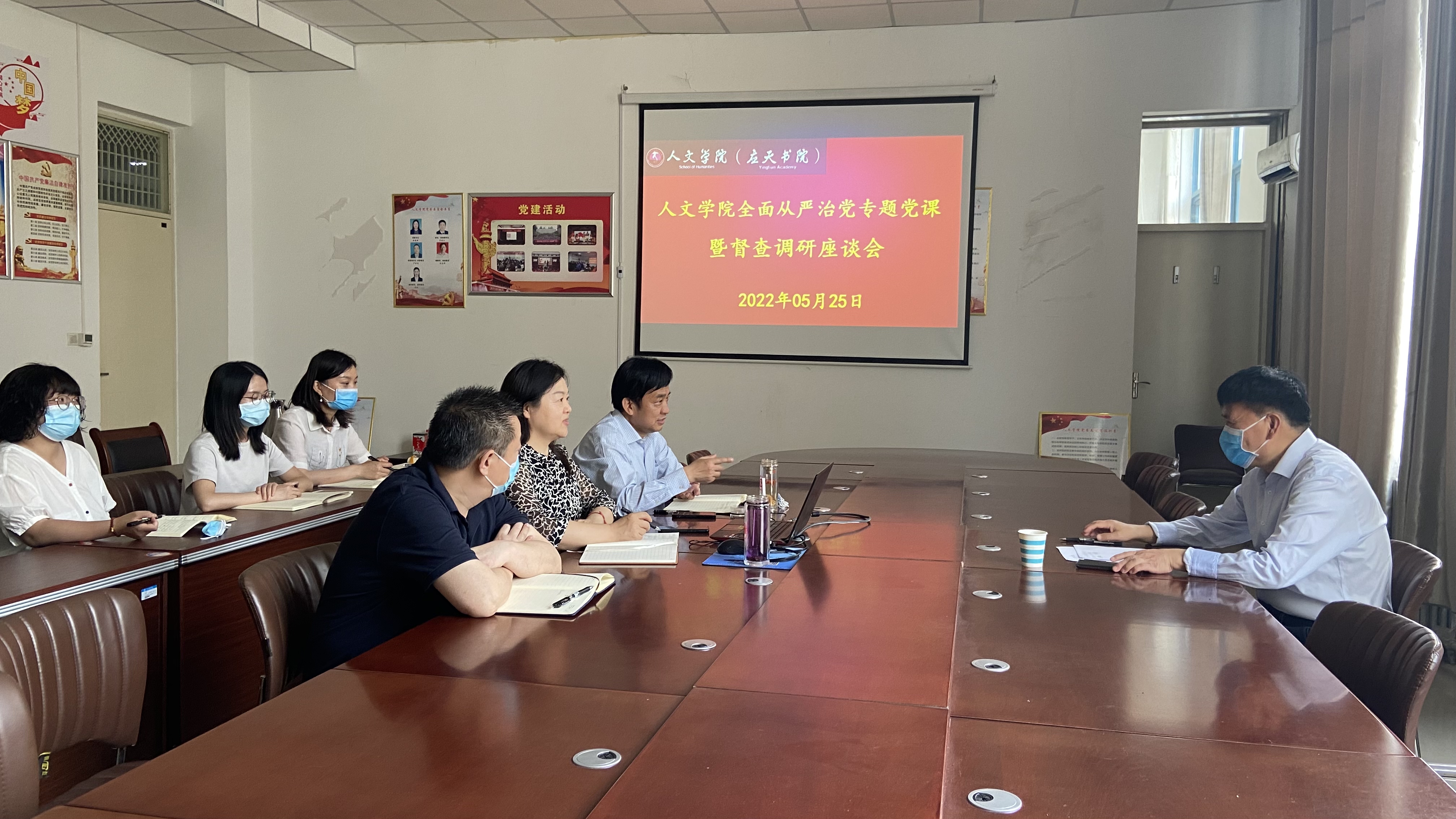 为推动党的建设高质量发展,把全面从严治党引向深入,5月25日下午,Beat365官方网站在汉梁楼208会议室开展全面从严治党专题党课暨督查调研座谈会。校党委副书记吴金山出席会议,学院班子成员、支部书记参加。会议由Beat365官方网站党委书记陈晓明主持。