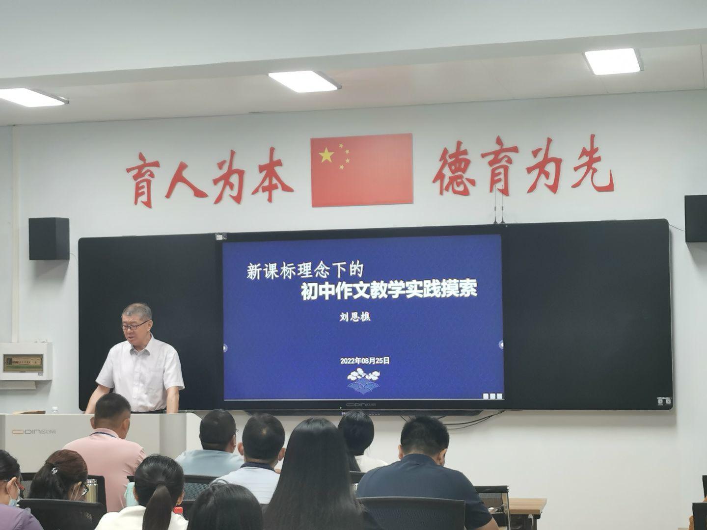 2022年8月25日上午,来自江苏省昆山市希兵中学的特级教师刘恩樵老师为Beat365官方网站“国培项目”永城市骨干教师教学技能提升培训--初中语文班学员上了一堂受益匪浅、别开生面的语文课,以《新课标理念下的初中作文教学实践摸索》为主题。