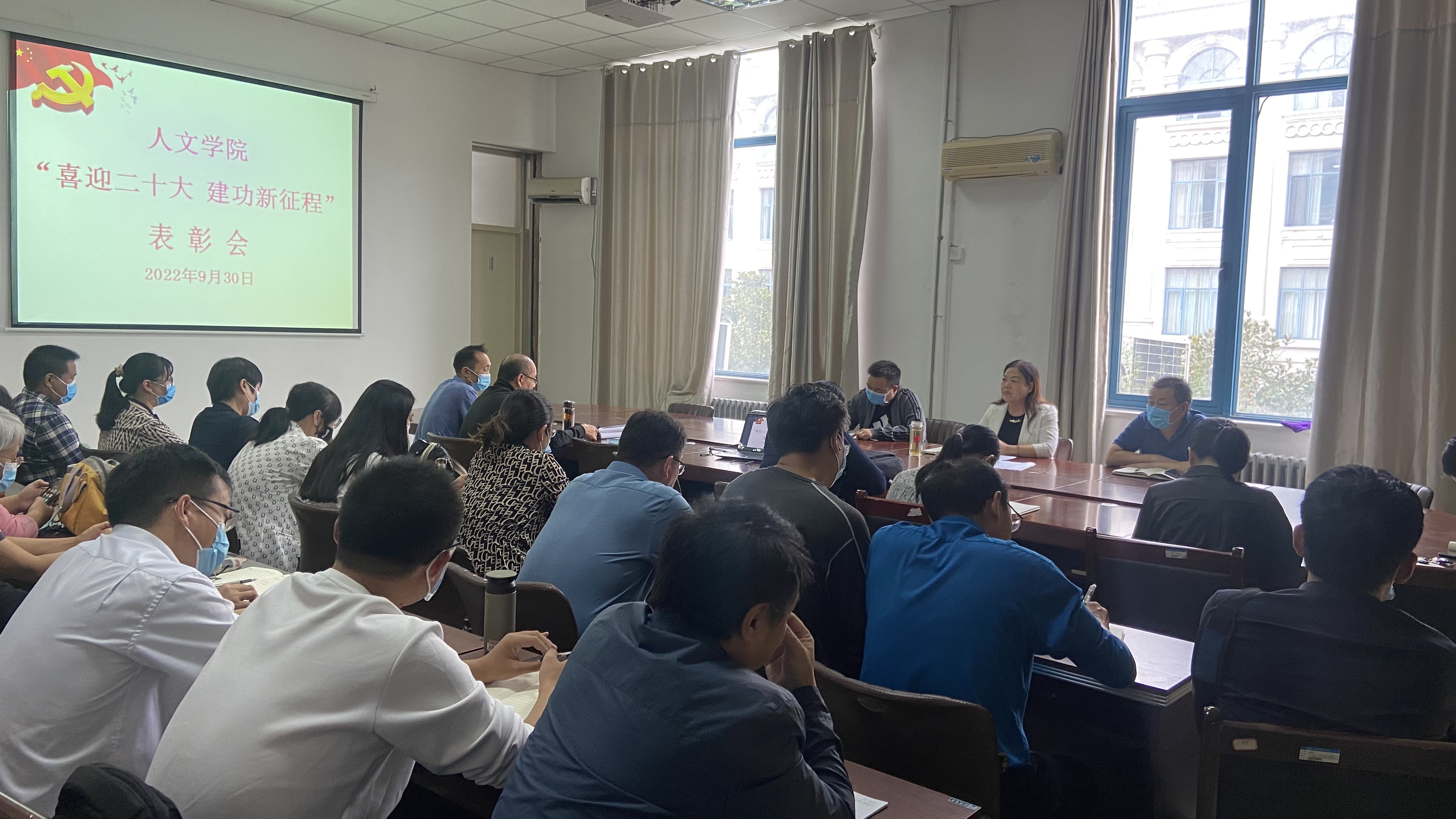 9月30日下午,Beat365官方网站党委在汉梁楼208会议室召开“喜迎二十大 建功新征程”表彰会,学院全体党员参加会议。