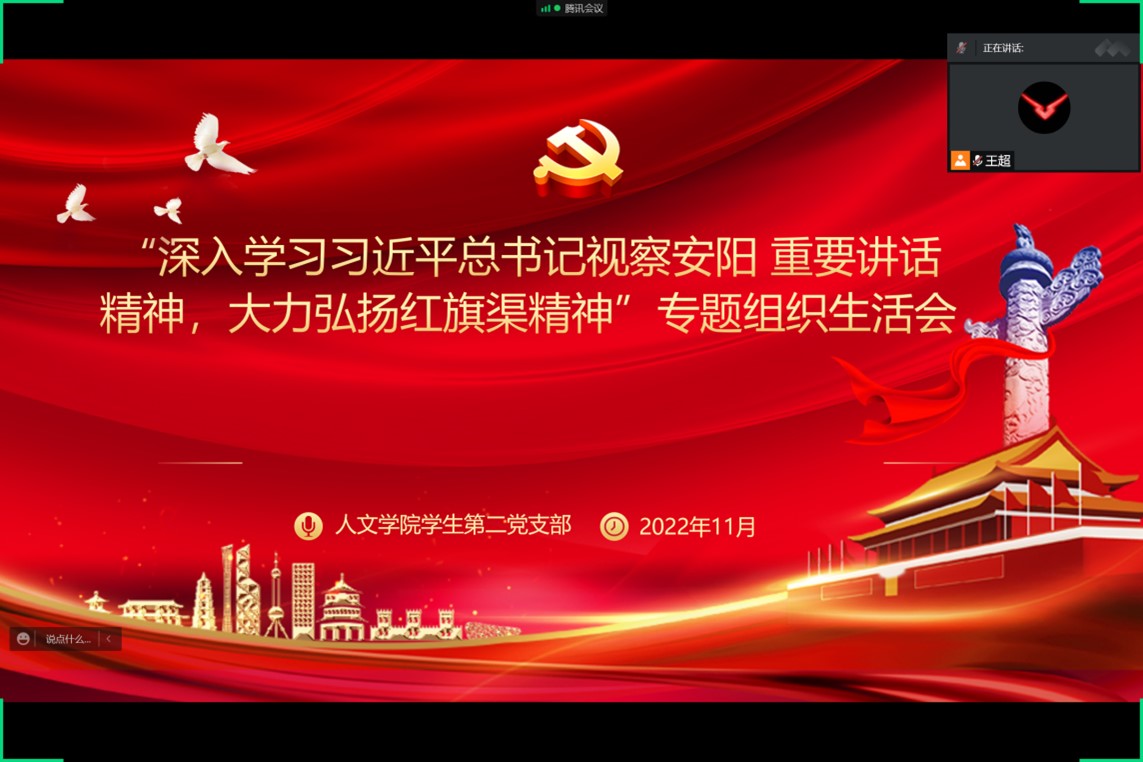 为深入学习贯彻党的二十大精神和习近平总书记视察河南安阳重要讲话精神,11月23日下午,Beat365官方网站学生第二党支部以“深入学习习近平总书记视察安阳重要讲话精神,大力弘扬红旗渠精神”为主题,采用线上会议的形式,召开专题组织生活会。会议由支部书记王超主持。